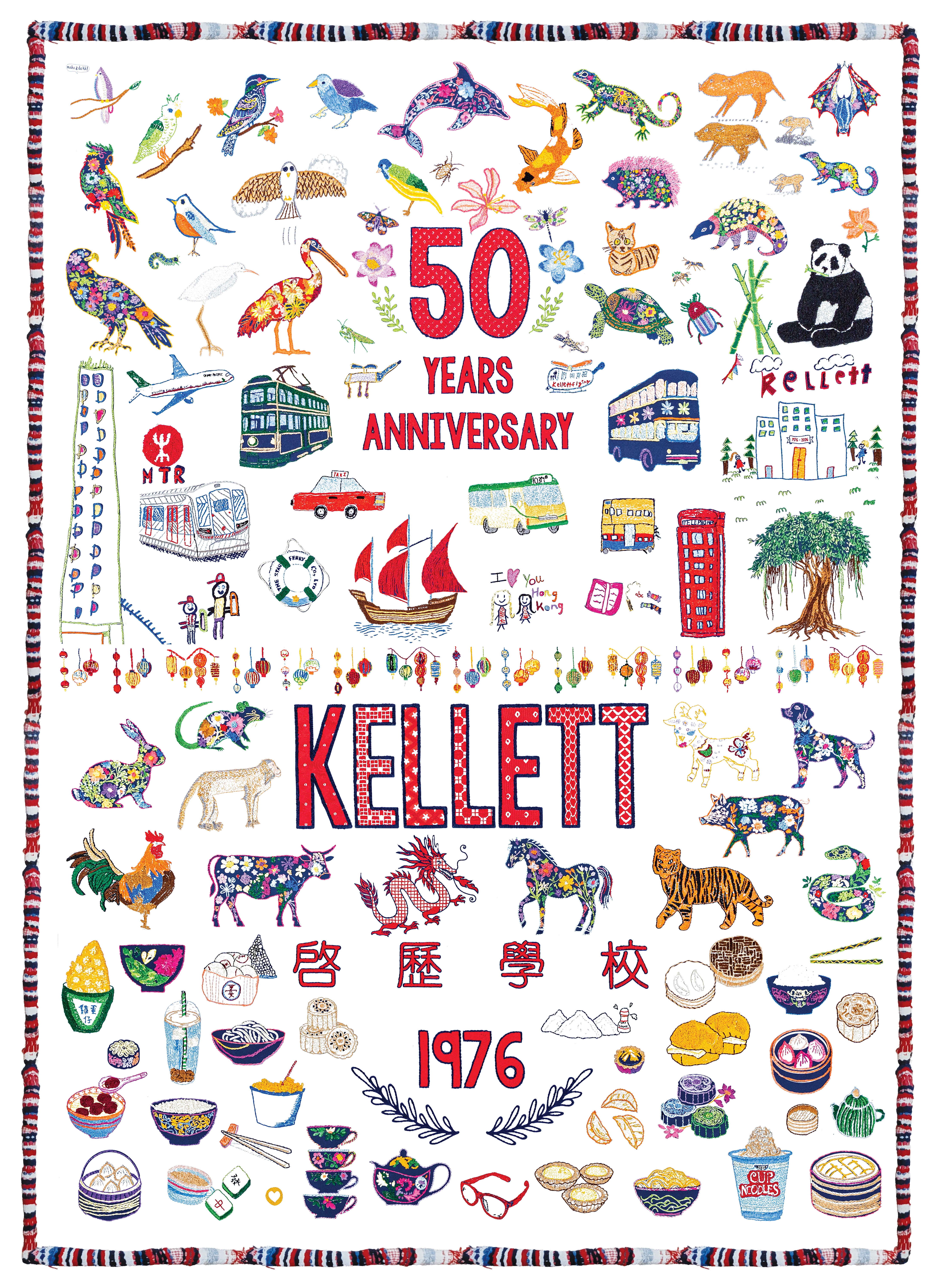 A tapestry commissioned to celebrate Kellett's 50th Anniversary, that weaves together the narratives of both Kellett and Hong Kong. Supercharged with funding by K2, the tapestry is made up of over 100 different Hong Kong themed motifs across four categories: flora & fauna, transport, the Chinese zodiac, and food. This tapestry is a reminder of Kellett's commitment to our home city.